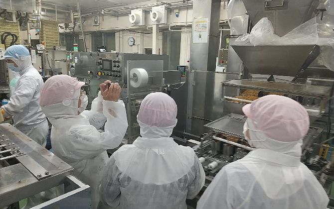 参加者は2グループに分かれて、工場見学を行いました。昭和21年に創業して今年で79年、納豆だけを作り続けているという(株)カジノヤは、北海道や秋田などの国産大豆を使用し、大豆のうまみを生かしてふっくらした納豆を製造しているメーカーで、たれ・からしも、家庭にある調味料を使用することにこだわっています。