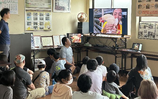 当日は、鶏舎の中と映像ライブ中継を行い、鶏舎内での給餌の様子などを見学しました。うまれて120日の若鶏は、まだ鶏舎にも慣れておらず、時おり恐がる様子も見られました。