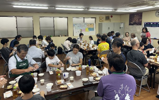 テーブルで参加者と生産者が軽食をとりながら、卵や産地のことなどたくさんお話しして交流を深めました。最後のクイズの時間では、ニワトリの雄雌の鳴き声の違いや、産地の卵について出題され、生産者から解説を受けながらみんなで楽しく学びました。
