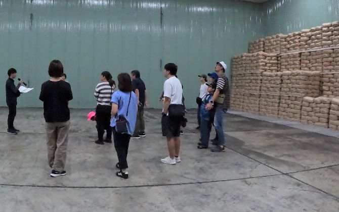 2日目は、お米の保管倉庫の見学からスタートしました。倉庫の中は品質管理のため低温に保たれており、入った瞬間に肌寒さが!「高く積まれた米袋の一番下の米は潰れないのか?」など、子どもからおとなまで積極的に質問が出ていました。