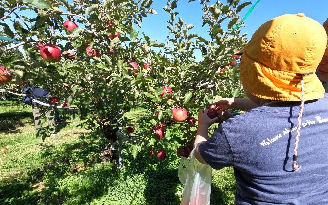 次に東和町のなかでも標高の高い東部りんご園で、生産者の気持ちになってていねいにりんごを収穫しました。