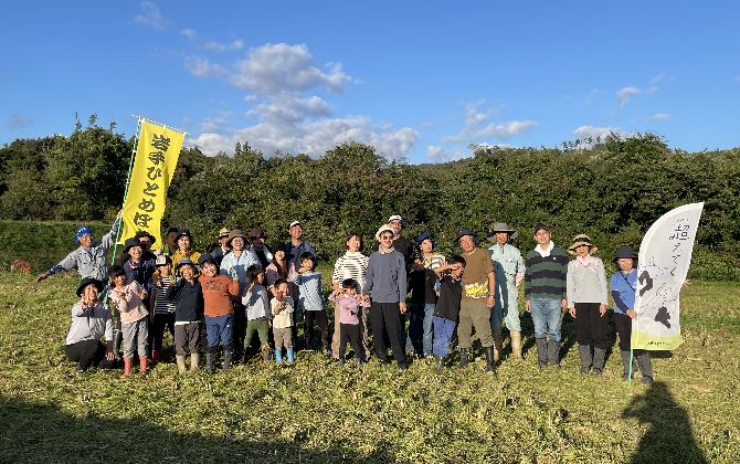 当組合と『エコ・岩手ひとめぼれ』の産地JAいわて花巻は「花巻食と農の推進協議会」を設立し、30年以上交流を続けています。生産者と組合員とが交流を重ねてきた「交流田」と呼んでいる田んぼで、今年も稲刈り体験を行いました。