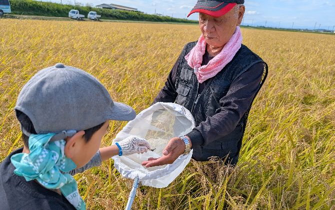 1日目は、JA新みやぎの田尻地域にある生産者高山さんの田んぼでの生きもの観察からスタートしました。この時期の田んぼでは、秋の風物詩「赤とんぼ」をたくさん見ることができます。