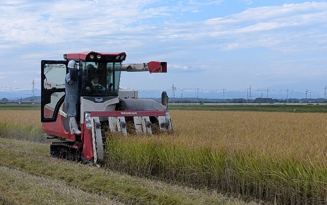生きもの観察のあとは、いよいよ稲刈り体験です。この日は晴天に恵まれ、生産者のみなさんもご自身の田んぼの稲刈り作業があるなか、時間を割いて多くの方が集まってくださいました。参加者は生産者から直接、稲を刈る鎌の使い方や束ね方を教わり、手刈りを体験しました。コンバイン(稲刈り機)の乗車体験では、はじめは大きな音を立てて走る様子に驚きながらも、生産者といっしょにコンバインへ乗って稲刈りを行いました。コンバインで稲を刈ったあとの田んぼには排出された稲わらが残りますが、稲わらは牛のエサになり、その牛の糞を堆肥にも利用するそうです。使用する資源を循環させ、自然環境への負荷を軽減する「資源循環型農業」への取り組みを知ることができました。