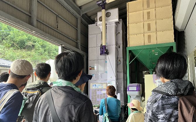 そのあとは、米倉庫を訪れました。稲刈りの時期を迎え、倉庫内には26,000袋(およそ780トン)のお米が保管されており、参加者はあまりの数に圧倒されている様子でした。生産者からは「倉庫中に米のかおりがするこの時期になると、秋が来たと感じる」というお話があり、米産地ならではの秋の訪れを、生産者とともに味わうことができました。
