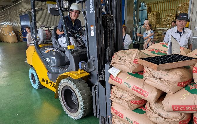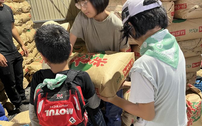 コンバインで刈り取った籾(もみ)を乾燥して、籾摺りから色彩選別機(玄米を袋詰めする際に、異物や変色した不良品を取り除く機械)を通して、玄米が出てくる一連の作業を見学しました。30kgの米袋に入った玄米を運ぶ作業も体験しましたが、ひとりではなかなか持ち上がらず、参加者同士が協力して、袋詰めされたばかりのお米を運ぶお手伝いをしました。