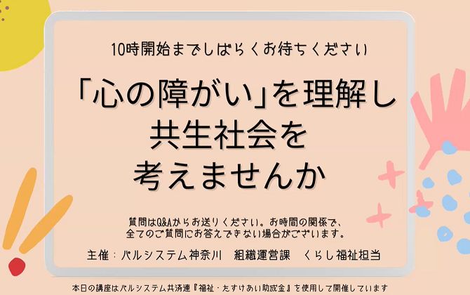 10月2日、「心の障がいを理解し共生社会を考えませんか」を開催し、新横浜本部での対面とオンライン参加者合わせて73名が参加しました。