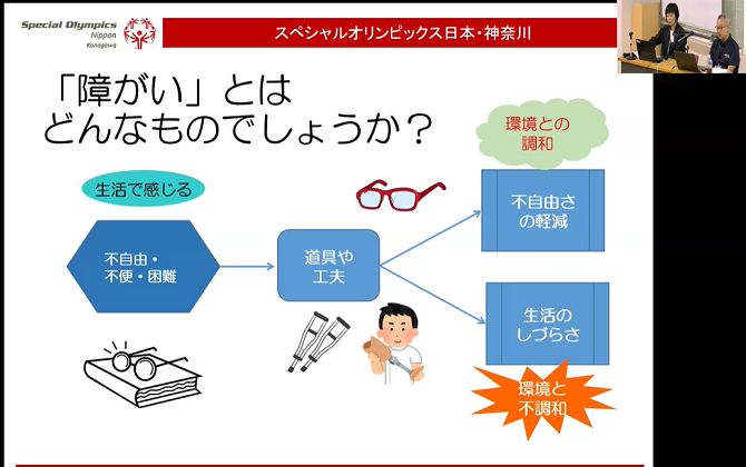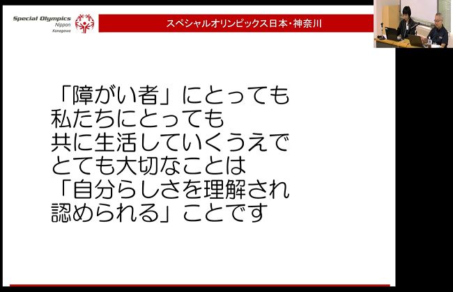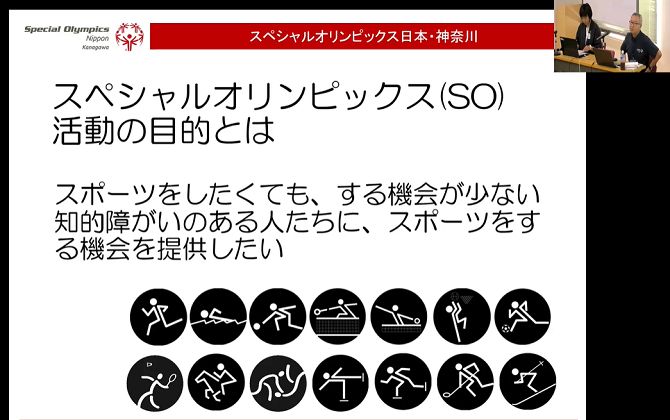 終盤には、山ノ内氏が事務局長を務めるスペシャルオリンピックス(SO)を紹介していただきました。スペシャルオリンピックス(SO)とは、スポーツをしたくても、する機会が少ない知的障がいのある人たちに、スポーツをする機会を提供したいという目的の世界的な組織です。