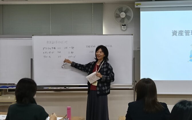 講師はまず、投資とはどのようなもので、なぜ投資が必要と言われているのか、そして資産管理の基本的な考え方について解説しました。次に、投資商品の種類、リスクとリターンなど、時には図を用いて具体的に紹介。敬遠しがちな企業情報の表についても、見るべきポイントが示され、「わからないから不安」を解消しました。