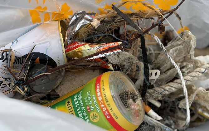 今回は、ほかの団体も同時にビーチクリーン活動をしており、ごみがそれほど多くは落ちていなかったのにもかかわらず、隅々まで探して小さなプラスチックやガラス片など、たくさんのごみをひろいました。海岸に打ち上げられた流木などといっしょに漁網が絡まっていたり、ペットボトルや缶なども落ちていました。