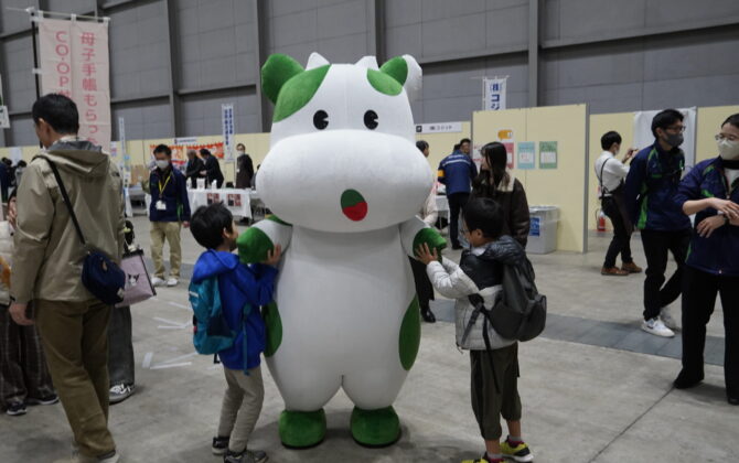 配送トラックやテレビCMなどでおなじみの牛のキャラクター「こんせんくん」の登場で、子どもたちは大喜び!たくさんの親子連れが写真撮影を行いました。