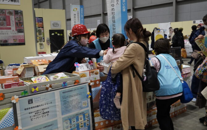 「フードバンクかながわ」のブースではフードドライブを実施。缶詰やレトルト食品に加え、2024年度産までの米も受け付けました 。