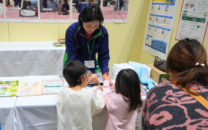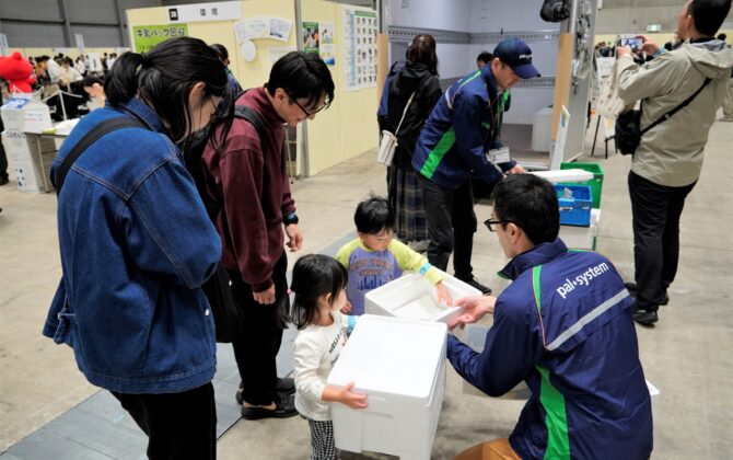 環境のブースでは、配達で回収している「牛乳パック」や「たまごパック」などを、種類ごとに分けるリサイクルの体験企画を実施しました。「これはこっちかな?」「紙とプラスチックはわけるんだよね」と、スタッフに教わりながら楽しむ子どもたちの様子が見られました。