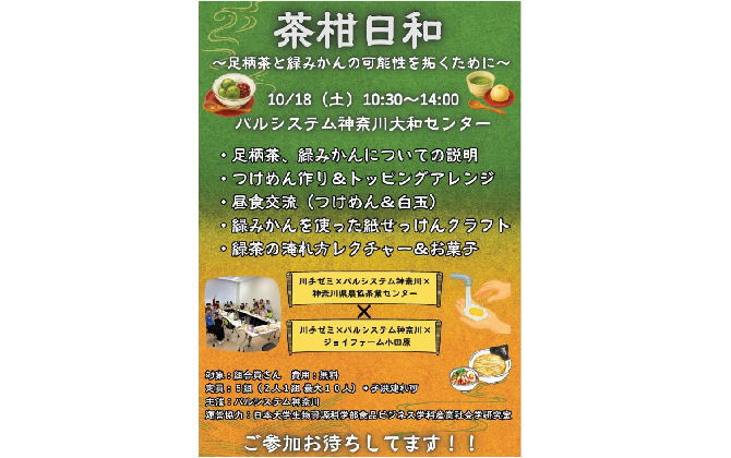 現地の視察を行ったゼミ生たちは、各自、足柄茶のプロモーション案や緑みかんシロップ・そのまんま緑みかんを使ったレシピの考案にとりかかりました。そして10月、大和センターで組合員を対象にした企画を開催しました。テーマは「『茶柑日和』 ~足柄茶と緑(あお)みかんの可能性をひらくために~」です。