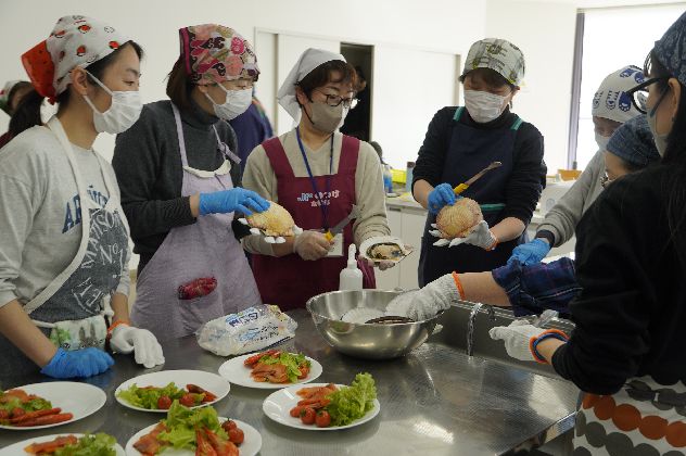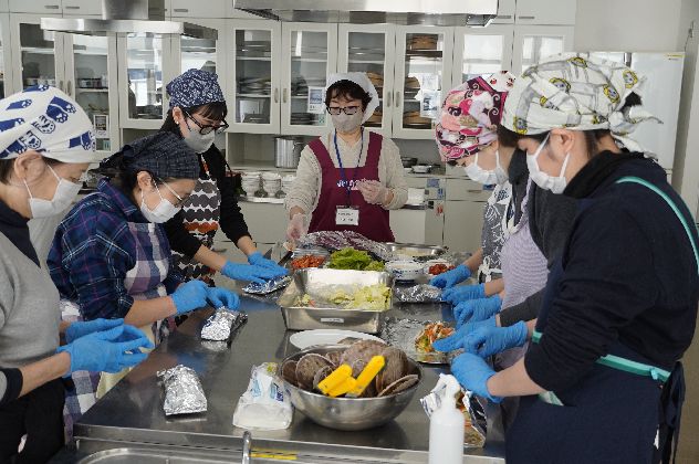 2月13日、相模原市立市民・大学交流センターユニコムプラザさがみはらにて、北海道野付漁業協同組合(以下、野付漁協)の女性生産者と交流する場として、「野付浜の母さん料理教室」を開催し、組合員18名とスタッフあわせて30名が参加しました。