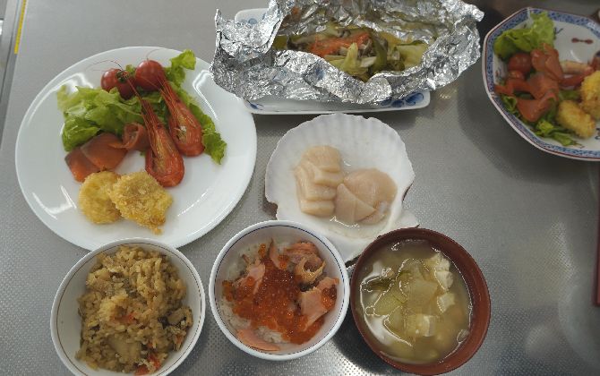 ちゃんちゃん焼きの味噌の香ばしい香りが調理室に広がり、待ちに待った食事の時間がやってきました。実際に調理したメニューに加え、ほたてがたっぷり入った炊き込みご飯や鮭といくらのミニ丼、秋鮭汁など、野付の海の幸をふんだんに使った料理を浜の母さんたちが事前に準備してくださっており、それらがテーブルいっぱいに並ぶと、とっても豪華な食卓に。浜の母さんや北海道漁連の方も同じテーブルにつき、おいしい食事をいただきながら、野付のことや料理のことなどで会話が盛り上がり、おなかも心もいっぱいに満たされるひとときとなりました。