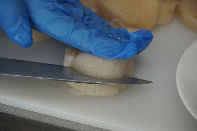 肉厚のほたてをフライ用にていねいにカットします