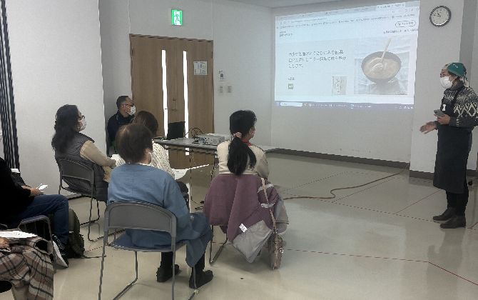 花見糖のYouTube動画の視聴、エリアメンバーによる花見糖とほかのお砂糖との違いの説明、花見糖を使ったパルシステムの商品の紹介などのあと、花見糖を使ったラスクのデモ調理をしました。