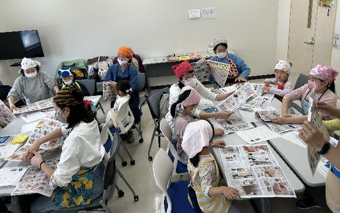 でき上がるまでの間では、チラシのお皿作りとクイズで防災に関する知識を深めました。