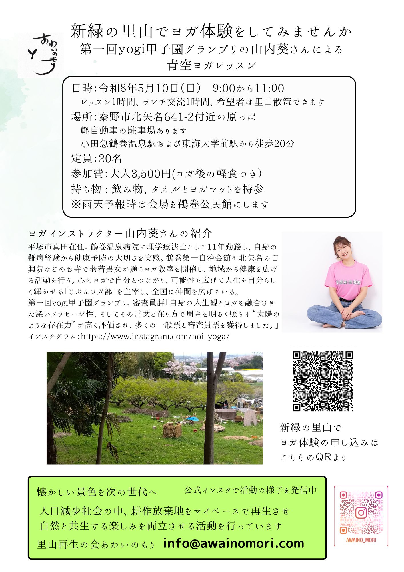 「里山再生の会あわいのもり」より、新緑の里山でヨガ体験のご案内です。
