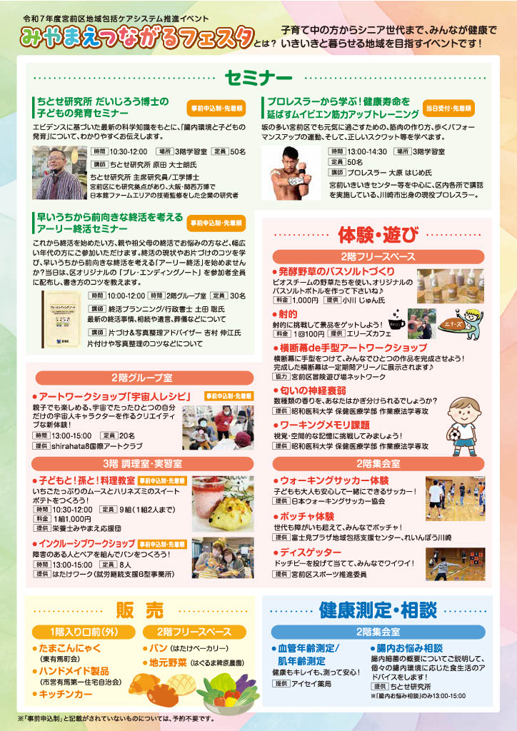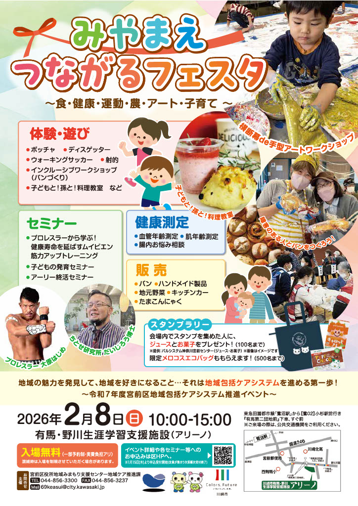 宮前区地域包括ケアシステム推進イベントとして、有馬・野川生涯学習支援施設(アリーノ)にて食・健康・運動・農・アート・子育てをテーマにワークショップや料理教室、セミナーや健康測定のほか、パンなどの販売も行います。