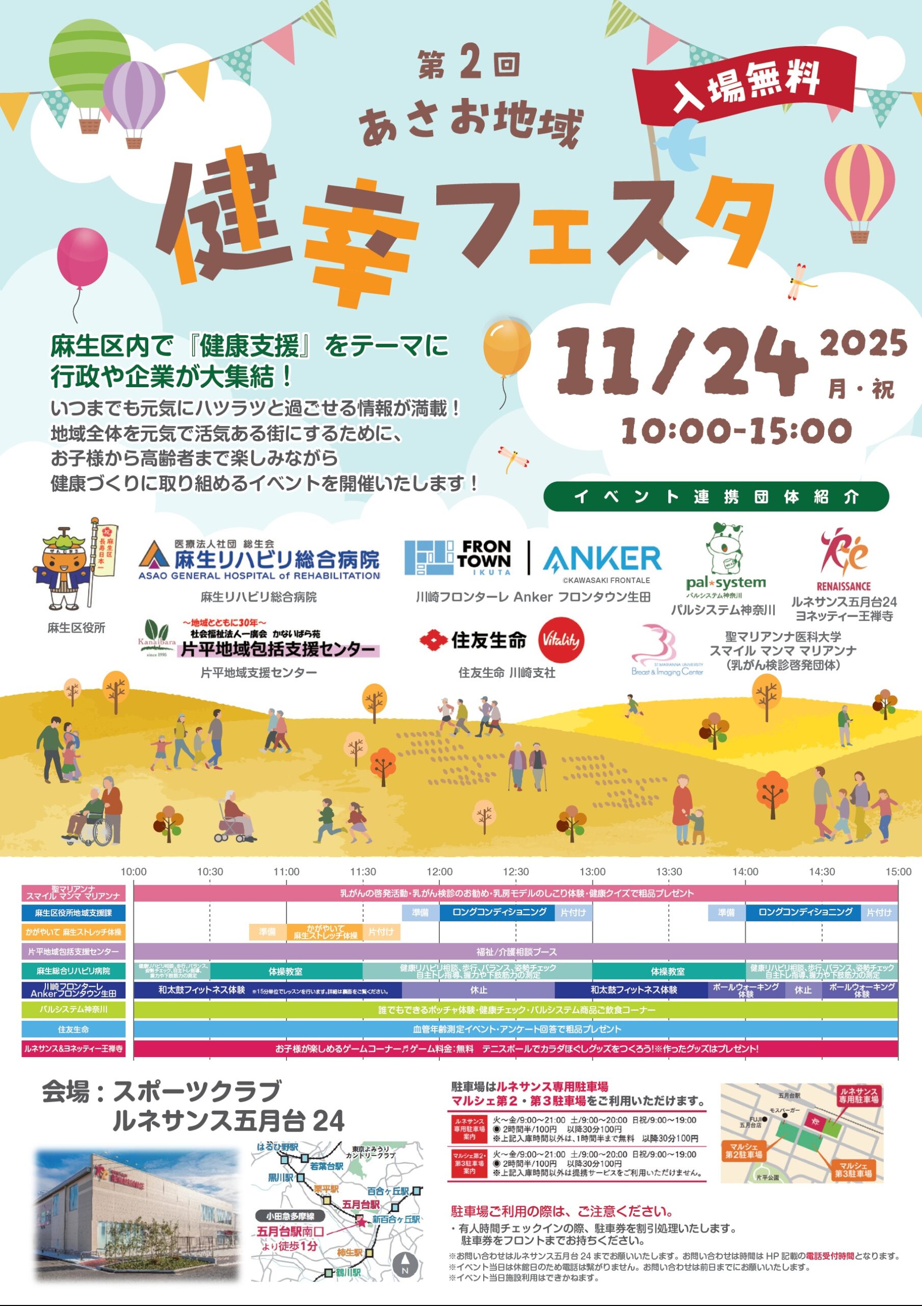 「健康支援」をテーマに川崎市麻生区の行政、企業が連携した地域イベントを開催。 いつまでも元気にハツラツと過ごせる情報が満載!地域全体を元気で活気ある街にするために、お子様から高齢者まで楽しみながら健康づくりに取り組めるイベントです!