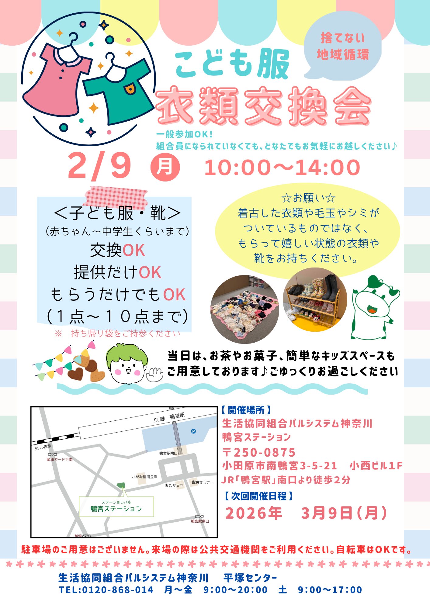 内容:衣類交換会ほか、当日はお茶やお菓子、簡単なキッズスペースをご用意しています。