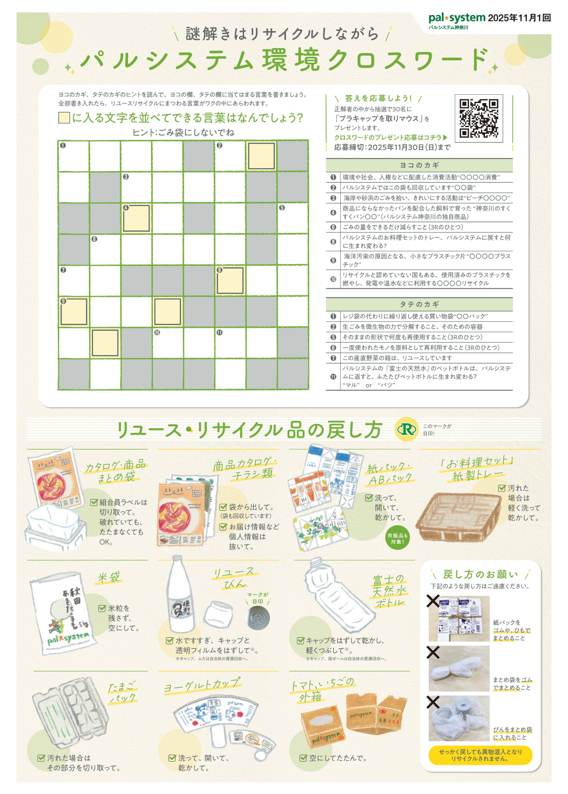 11月1回(10/20-10/24)配付の神奈川環境チラシに掲載している「パルシステム環境クロスワード」はちょっと難しい!?