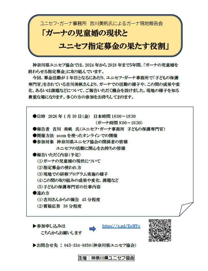 神奈川県ユニセフ協会では、2024年から2028年まで5年間、「ガーナの児童婚を終わらせる指定募金」に取り組んでいます。