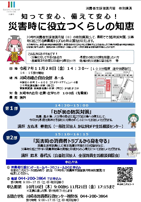 川崎市 消費者行政センター主催のイベント。「わが家の防災対策」、「災害時の消費者トラブルから身を守る」をテーマに災害時に役立つくらしの知恵について学びます。