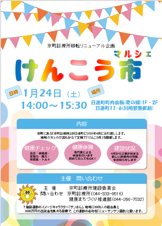 | 申込/お問い合わせ | こちらは、地域のイベントを紹介するページです。内容等の詳細につきましては、主催団体に直接お問い合わせください。 問い合わせ 京町診療所(044-333-9516)/健康まちづくり推進部(044-266-7532) |