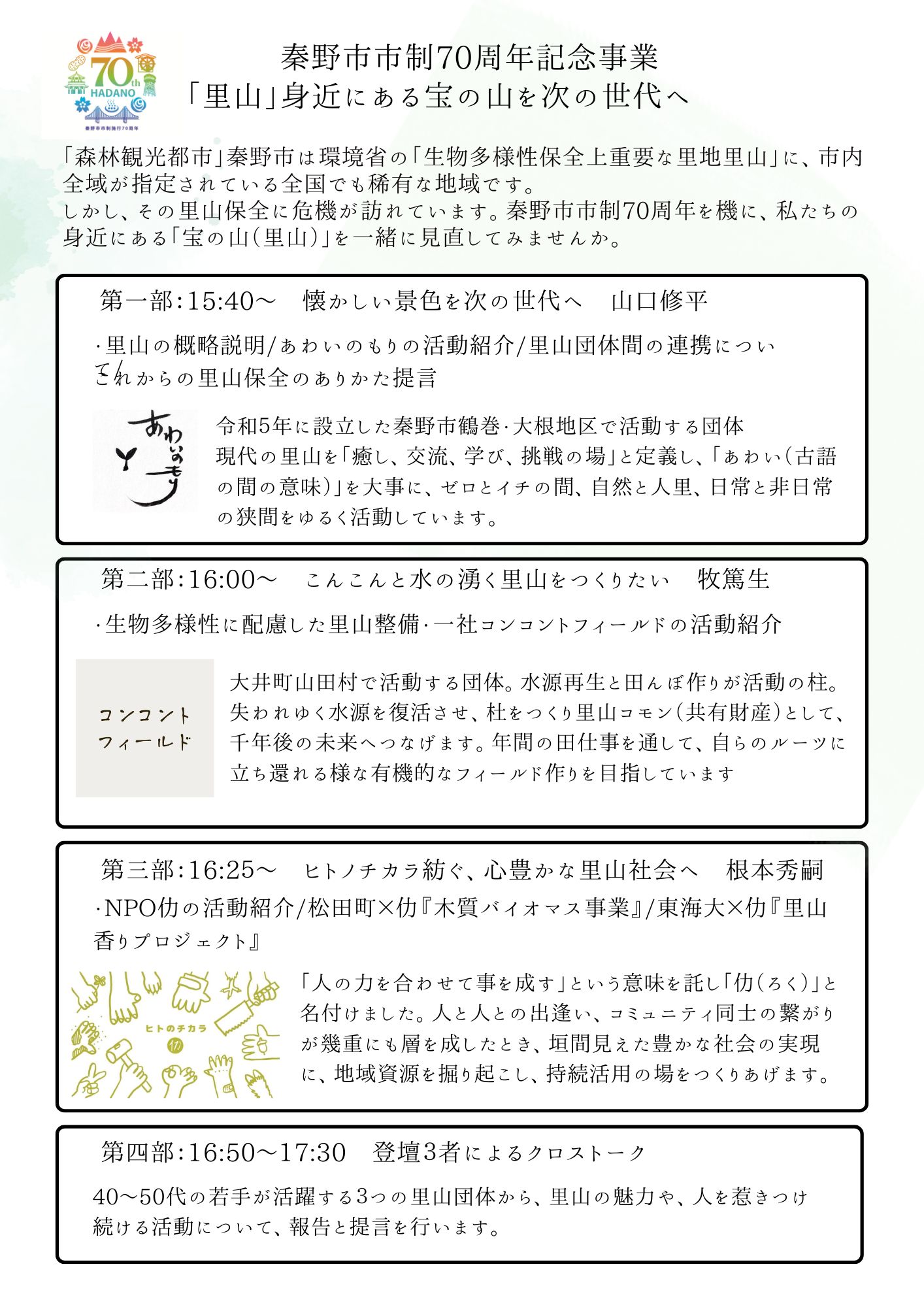 「里山再生の会あわいのもり」より、『秦野市市制70周年記念事業「里山」身近にある宝の山を次の世代へ』のご案内です。