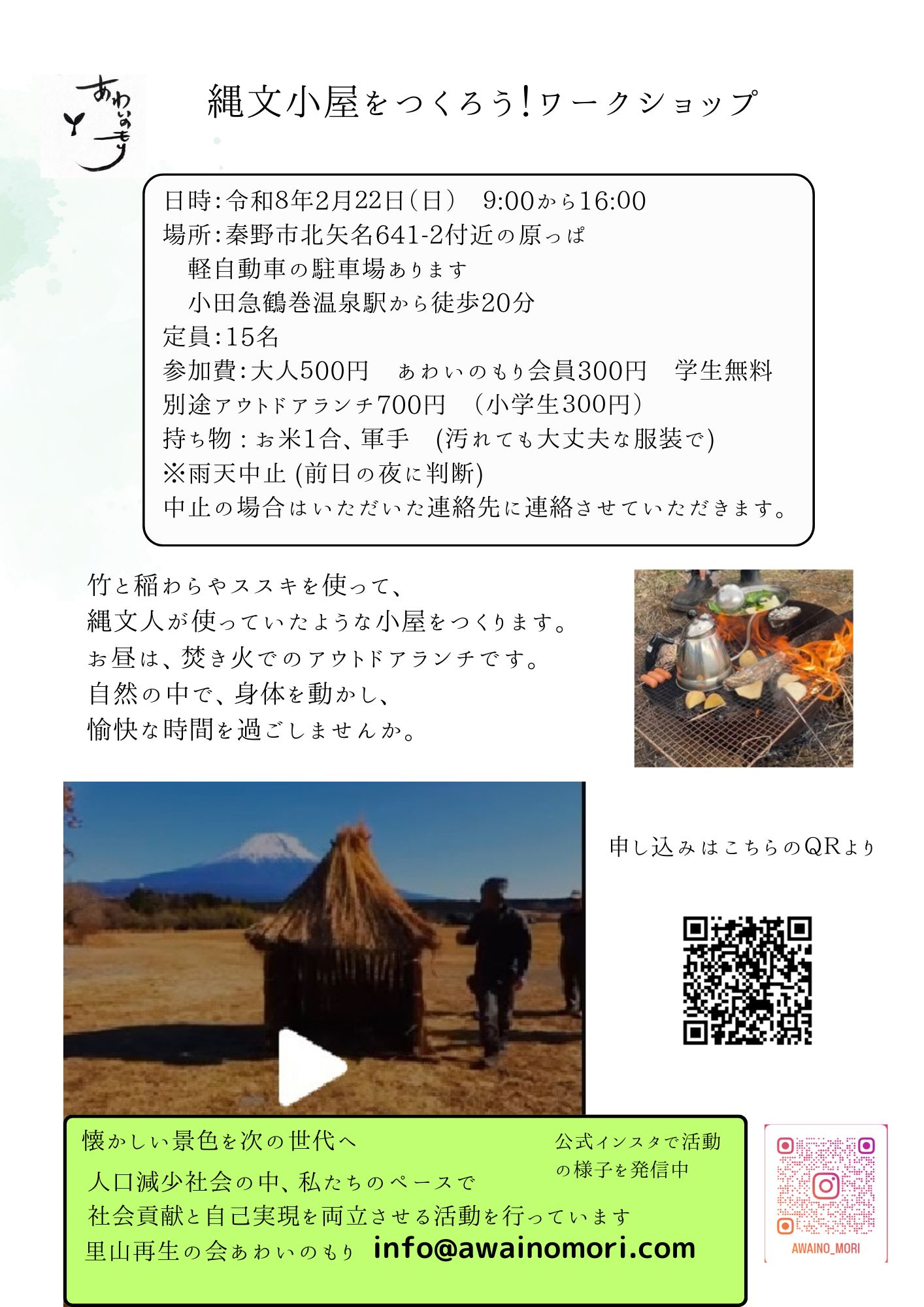 「里山再生の会あわいのもり」より、縄文小屋をつくるワークショップのご案内です。
