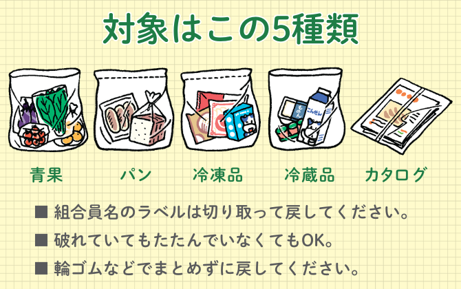 商品やカタログをお届けするときにまとめている袋(まとめ袋)をパルシステムに戻して、1枚につき1ポイント、最大5ポイントをもらおう!