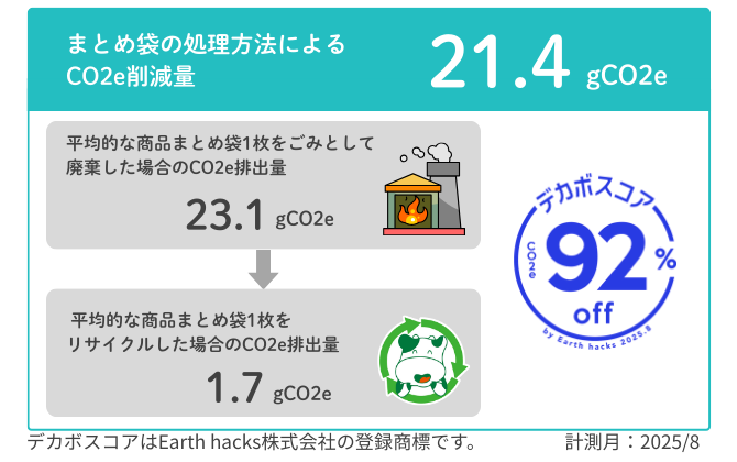 まとめ袋をパルシステムに戻してリサイクルした場合、ごみとして廃棄した場合よりCO2排出量を92%削減できます。