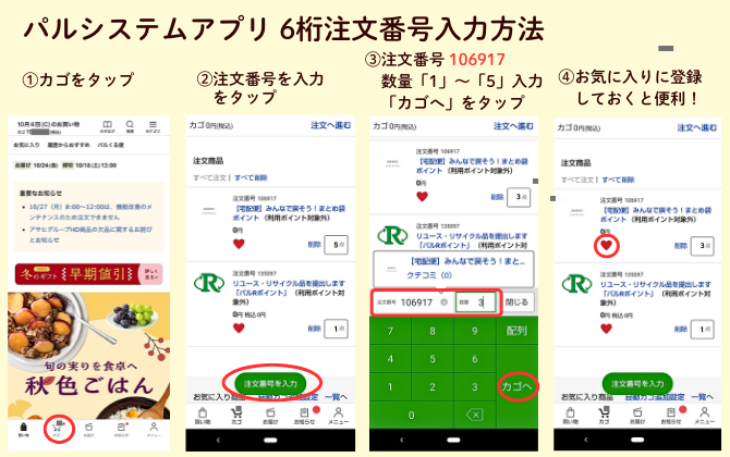 ③注文番号と数量を入力し、「カゴへ」をタップ