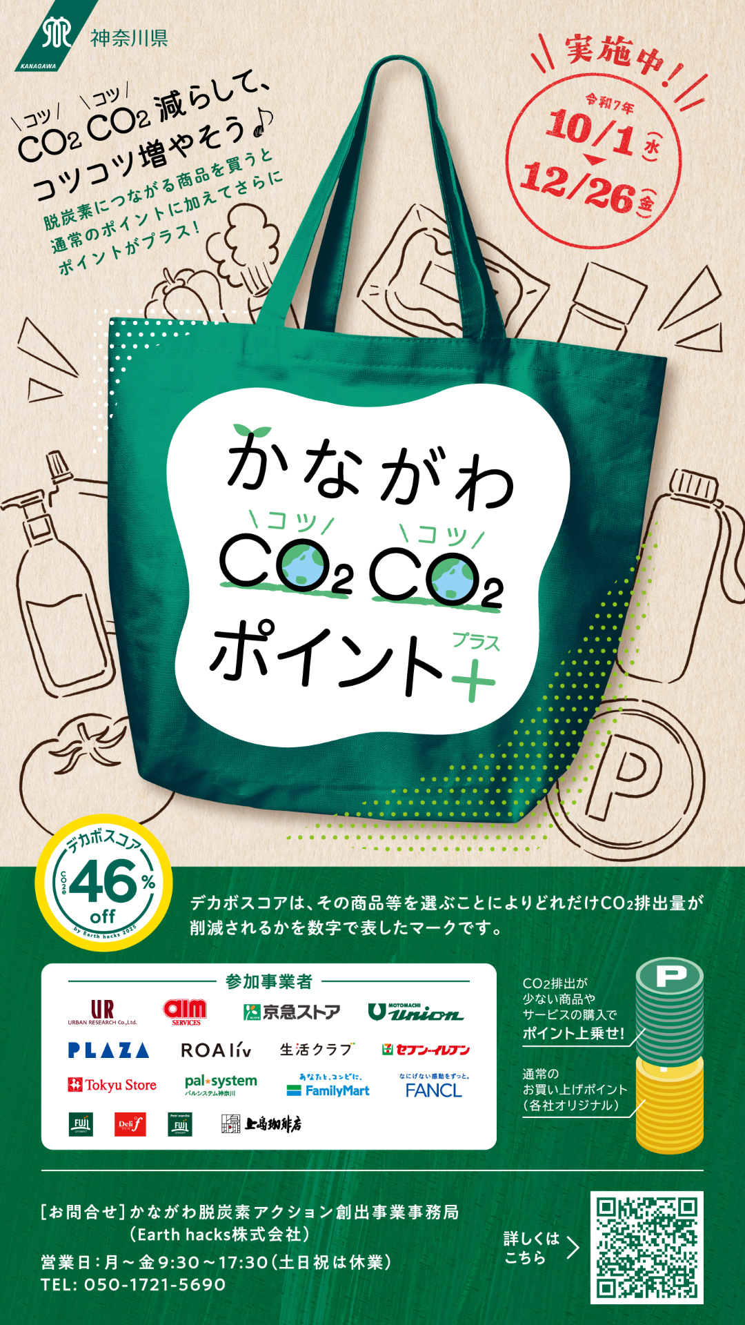 今年度、「かながわCO2CO2(コツコツ)ポイント+(プラス)」キャンペーンには、当組合のほかコンビニエンスストアを含む県内約800の店舗等が参加しています。