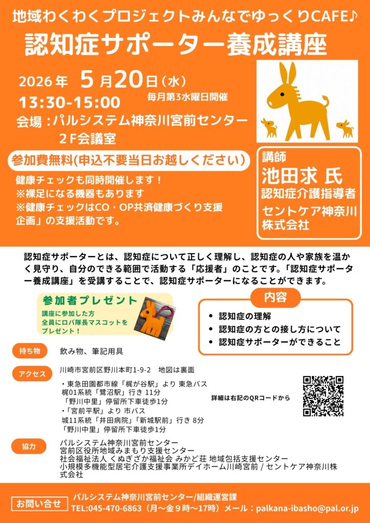 | 主催 | <協力> パルシステム神奈川宮前センター 宮前区役所地域みまもり支援センター 社会福祉法人くぬぎざか福祉会 みかど荘地域包括支援センター 小規模多機能型居宅介護支援事業所デイホーム川崎宮前 セントケア神奈川株式会社 |