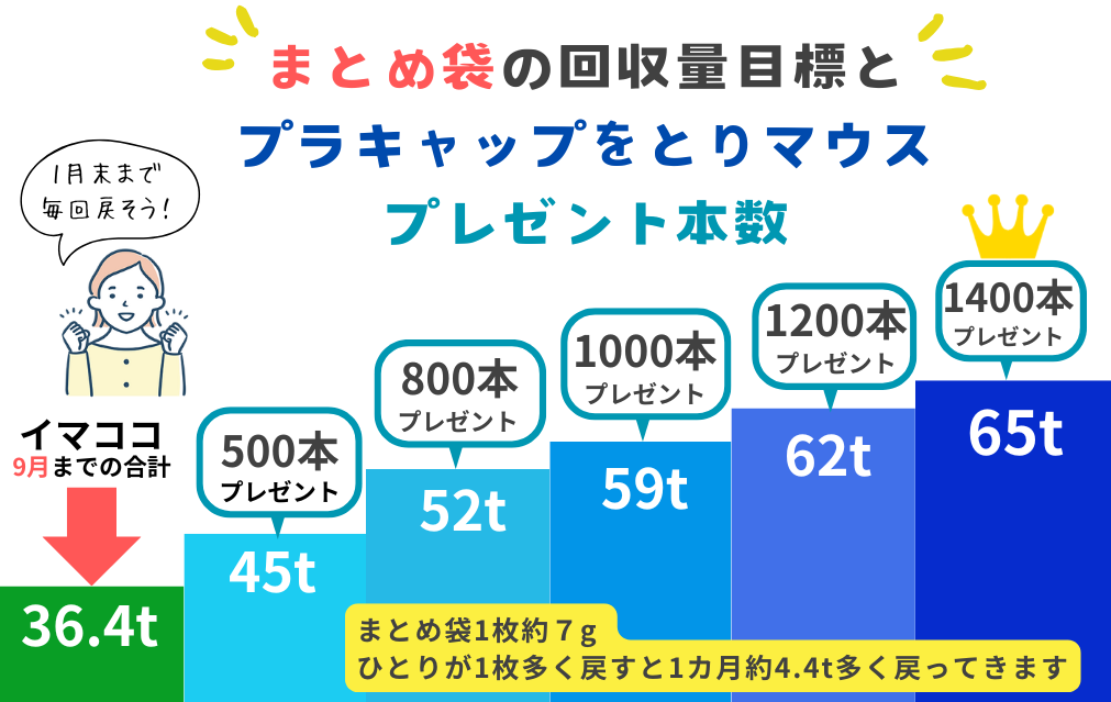 2026年1月末までにみなさんから戻してもらったまとめ袋の量に応じて、応募者にプレゼントする数が決まるしくみ。 たくさん戻せば戻すほど当選確率もアップします。