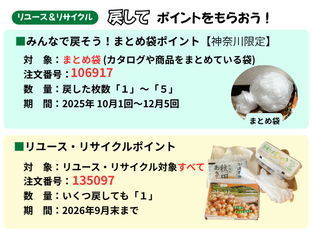 まとめ袋を戻して毎週最大5ポイントもらえる「みんなで戻そう!まとめ袋ポイント」キャンペーンも12月5回で終了です。12月4回・5回は同時注文になりますのでご注意ください。