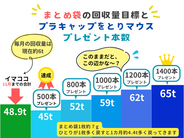 2026年1月末までにみなさんから戻してもらったまとめ袋の量に応じて、応募者にプレゼントする数が決まるしくみ。 たくさん戻せば戻すほど当選確率もアップします。