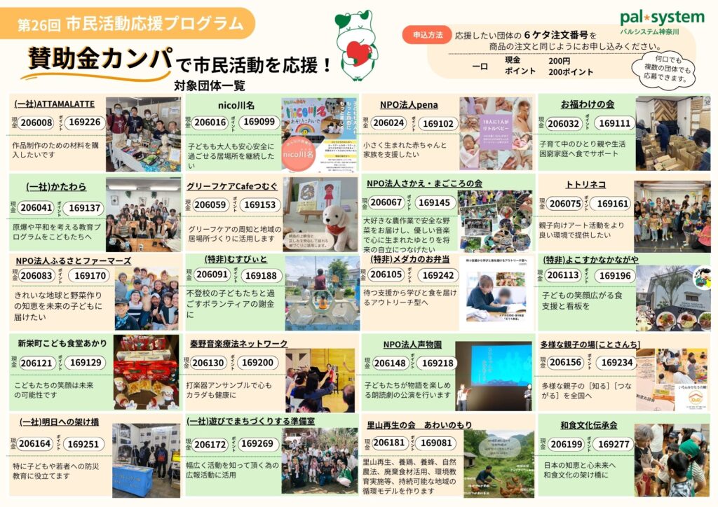 申込/お問い合わせ | お問い合わせ:パルシステム神奈川 市民活動応援プログラム事務局 TEL:045-470-6863(月~金 10:00~16:00) mail:palkana-shimin@pal.or.jp |