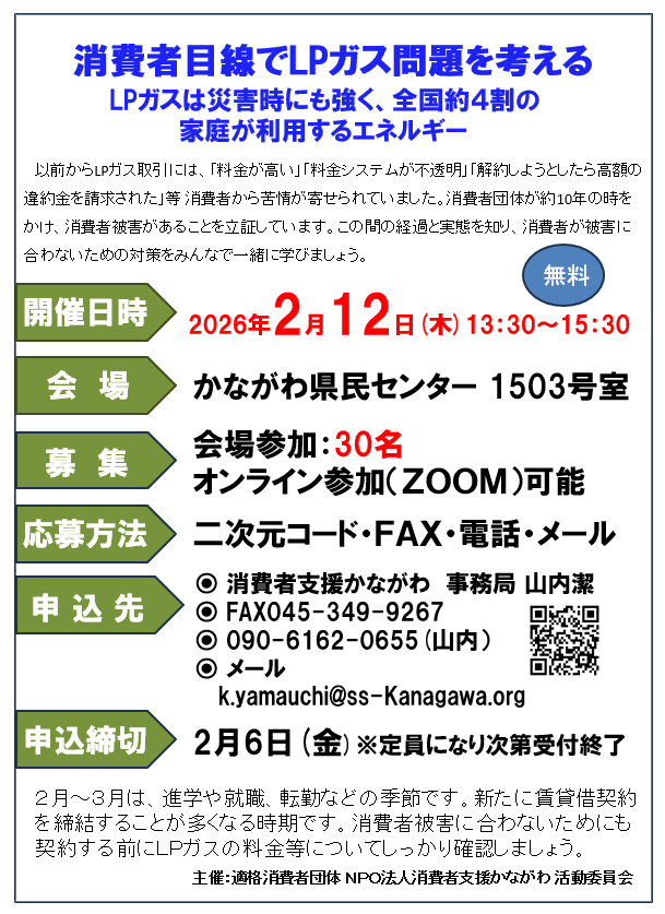 | 主催 | 主催:適格消費者団体 NPO法人消費者支援かながわ 活動委員会 |