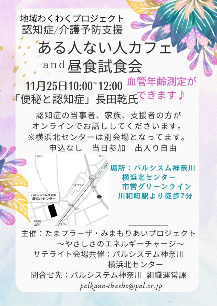 オンラインと地域の会場の参加者がつどうオンラインカフェです。認知症の当事者、家族、支援者の方がオンラインでお話ししてくださいます。先々、自分や家族がその当事者になることも考えられます。その時に備えてみんなで色々なお話ししませんか?サテライト会場の横浜北センターでお話しを聞いた後は昼食試食があります♪血管年齢も測定できます~♪※出入り自由です。