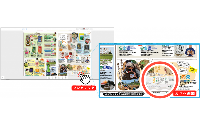 デジタルカタログ上で商品をワンタップ(クリック)するとカゴへ追加できます