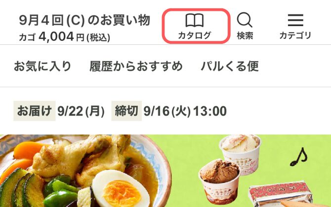 ▼注文サイト(PC・スマホ)、アプリ『パルシステムアプリ』ヘッダー「カタログ」