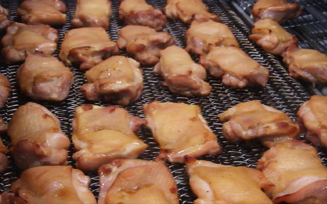 あらかじめ蒸した鶏肉にたれを付けてからオーブンで香ばしく焼成